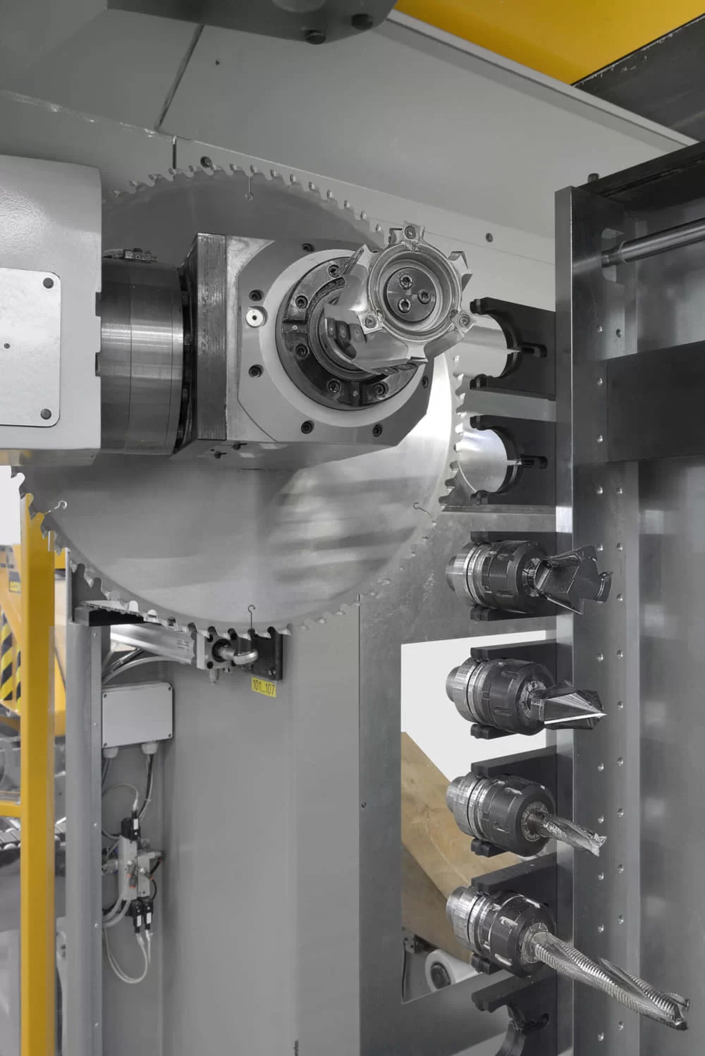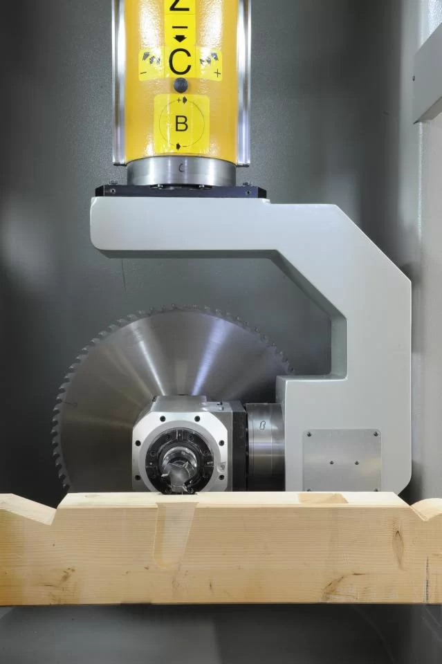The processes are performed by a 5-axis head with a dual output motor: one with HSK 63F tool connection for the automatic tool change; the other with a flange for the blade with a maximum diameter of 600 mm
