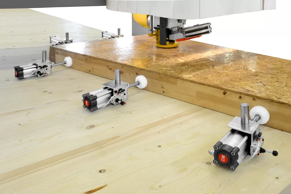 Flexible beams locking system for frame walls with pneumatic pistons.